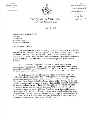 Senator George Della (D-46) has written the following letter questioning the Governor's choice of a Red Line alignment. Della, who represents Red Line skeptics in the east-side Canton neighborhood, raises some interesting questions about the Maryland Transit Administration that we will explore next week.