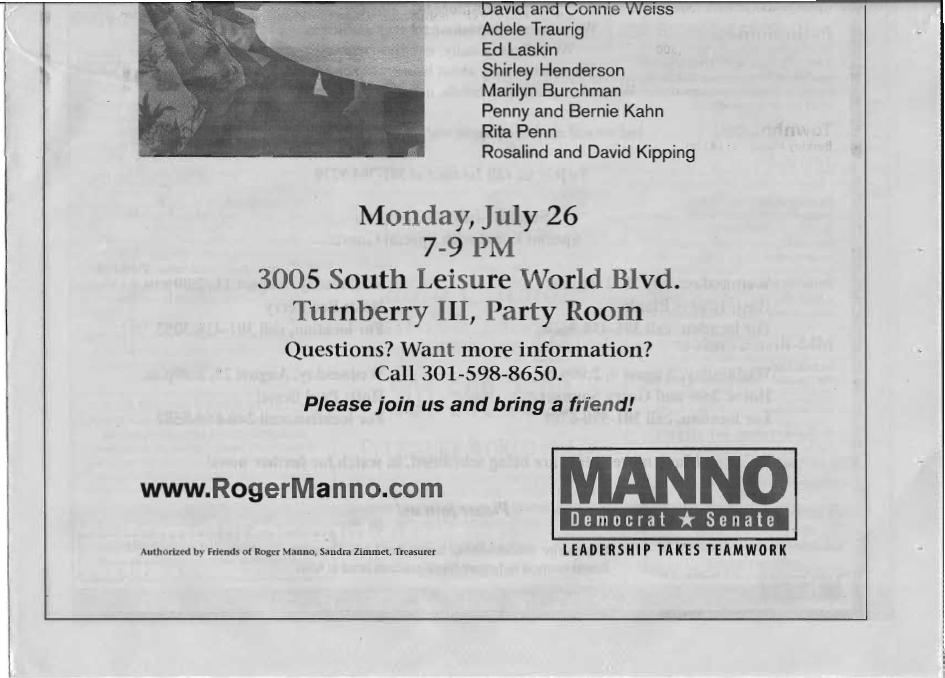 District 19 Senator Mike Lenett and challenger Roger Manno are waging an intense struggle in Leisure World, the largest single location of votes in the district. In 2006, 14% of all Democratic primary votes for Senate were cast in Leisure World. In the Delegate race, Leisure World accounted for 15% of all primary votes. Our spies in the highly coveted enclave report that both candidates are working so hard for support that they are virtually living there. Following are their latest ads from the July 20 edition of Leisure World News.