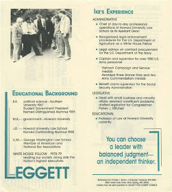 This is a mailer from Ike Leggett's first campaign for an at-large County Council seat in 1986. Leggett finished second that year and finished first in his next three races. Leggett's record of winning six county-wide elections has been surpassed only by Neal Potter, who served six terms on the council and one as County Executive.